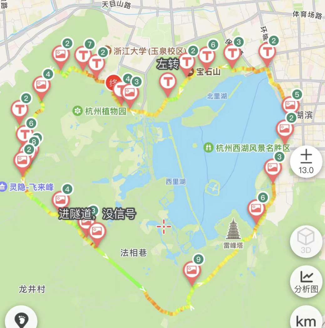 本次环西湖爱心线共计20km,预计耗时六小时,累计爬升600米,轨迹图形似爱心,是一个难度较低、强度较低的线路